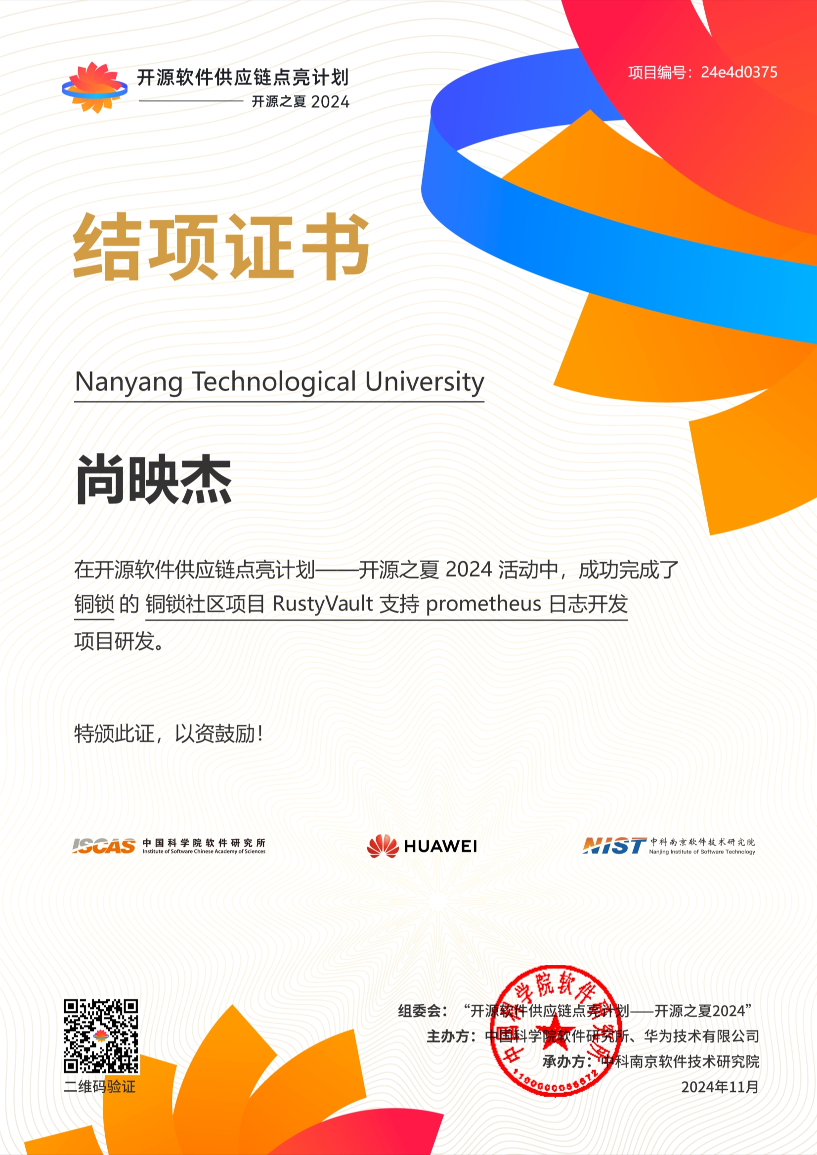 开源之夏今年有455位同学通过了结项审核,为进一步鼓励这些新生的开源力量,组委会特邀请指导委员会老师从最佳质量奖、突出贡献奖、最快进步奖、最具潜力奖4个方向评选出具有代表性的 20 位优秀学生。其中,尚同学在“RustyVault支持Prometheus日志开发”项目中表现卓越,由于其学习能力强,迅速掌握了Rust语言以及Prometheus的仪表化技术,技术基础扎实,在面对复杂项目时,能运用科学方法解决问题,从众多同学中脱颖而出,荣获“最具潜力奖”。
